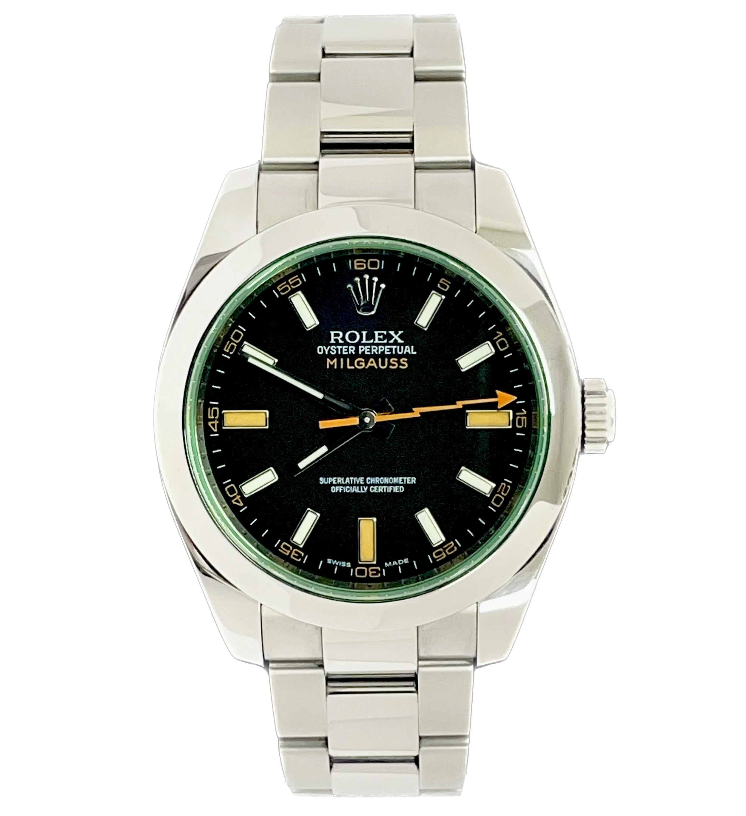 The Rolex Milgauss (Ref. 116400) is a unique timepiece designed for professionals working in high-magnetic environments. Featuring a 40mm stainless steel case, it boasts a clean black or white dial with luminous hour markers and the signature lightning bolt seconds hand in orange. Engineered to resist magnetic fields up to 1,000 gauss, it is powered by the Caliber 3131 automatic movement for precision and durability. Paired with an Oyster bracelet and offering 100m water resistance, the 116400 is a distinctive blend of innovation, functionality, and Rolex’s signature style. Come try it on in our store in Saint George, Utah or text/call us at 801-376-8463 for questions or inquiries.